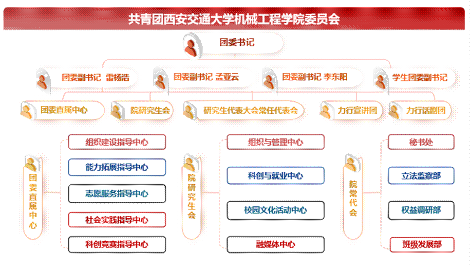 院团委设置团委书记1名、副书记3名、学生副书记5名。院团委下设5个直属中心,负责36365线路检测中心no1团组织的思想引领、组织建设、科创实践与考核评优等工作,为学院基层团组织提供指导和服务。同时指导学院研究生会、研究生代表大会常任代表会和力行宣讲团开展工作。各直属中心主要职能如下: