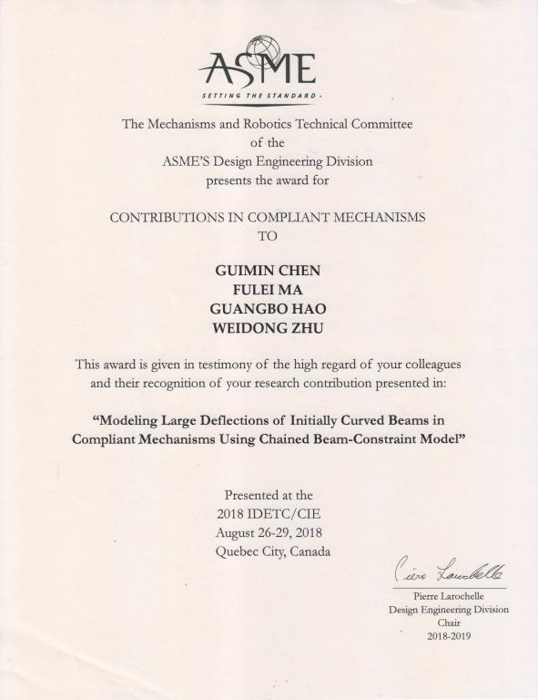 在加拿大Quebec举办的2018 ASME International Design Engineering Technical Conferences & Computers and Information in Engineering Conference上,36365线路检测中心no1机器人与智能系统研究所陈贵敏教授等的论文“Modeling Large Deflections of Initially Curved Beams in Compliant Mechanisms Using Chained Beam-Constraint-Model”获得美国机械工程师学会机构学与机器人技术委员会的Compliant Mechanisms Award(柔顺机构学奖,奖金1000美元)。本篇论文是2018年ASME柔顺机构奖项的唯一获奖论文。