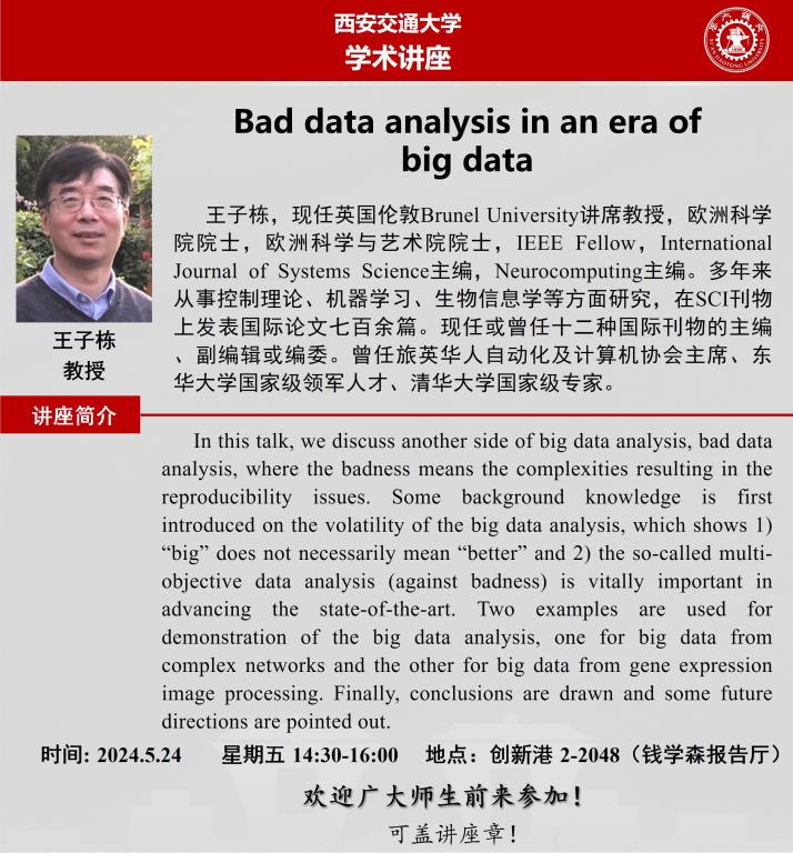 个人简介:王子栋,现任英国伦敦Brunel University讲席教授,欧洲科学院院士,欧洲科学与艺术院院士,IEEE Fellow,International Journal of Systems Science主编,Neurocomputing主编。多年来从事控制理论、机器学习、生物信息学等方面研究,在SCI刊物上发表国际论文七百余篇。现任或曾任十二种国际刊物的主编、副编辑或编委。曾任旅英华人自动化及计算机协会主席、东华大学国家级领军人才、清华大学国家级专家。