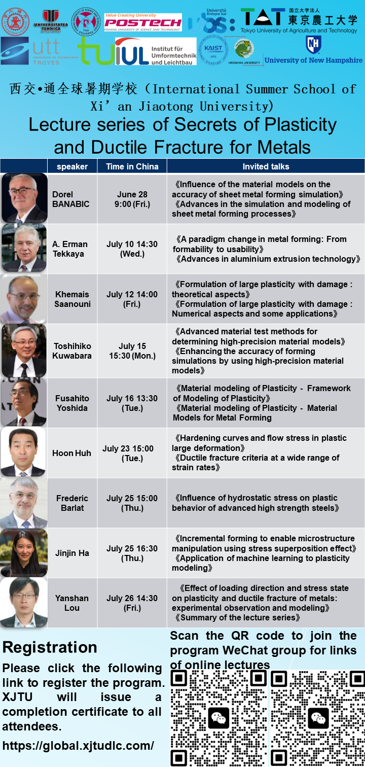 Thislecture series is given by many leading researchers (including three academicians) from Germany, France, Romania, Japan, USA, South Korea and China, aiming to summarize the phenomena of plasticity and ductile fracture of metals and their constitutive modeling methods by 18 invited talks. The scope of these talks includes advanced experimental techniques, classical and novel constitutive models,andcutting-edge plastic forming processes. The lecture series will introduce anisotropic plastic deformation, strength differential effect, kinematic hardening, Bauschinger effect, hydrostatic pressure effect, yield surface evolution, kinematic hardening, anisotropic hardening, forming limit, damage, ductile fracture, strain rate effect, machine learning, advanced aluminum extrusion technology, incremental forming, etc.