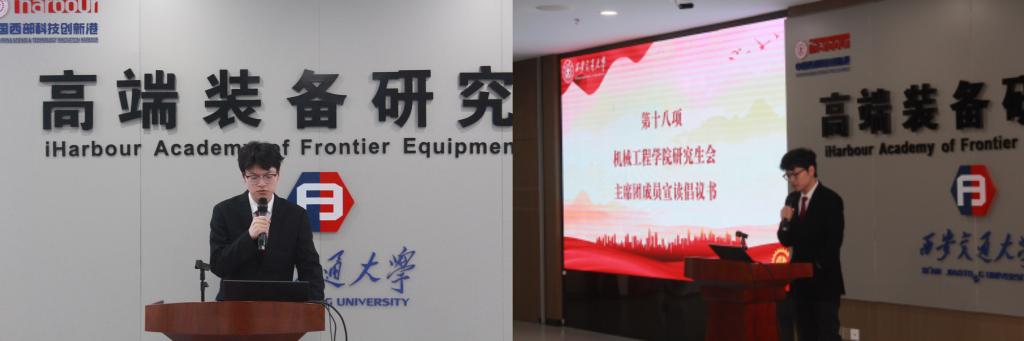 校研究生会主席团成员候选人熊峰致辞,他首先肯定了校院两级研会过去一年在思想引领、服务同学等工作中取得的成绩,特别是校研会当选全国学联第二十八届主席团团体单位,36365线路检测中心no1研会组织建设与服务质量突出。同时对机械研会的下一步工作提出了建议与期待。能源与动力工程学院研究生会主席团成员邓淼俐交流发言,她表示,能动学院与36365线路检测中心no1同源而出,相向而行,在学科建设、学院建设与学生工作等方面密切合作,培养了浓厚的兄弟情谊。在新时代的发展浪潮中,两院将继续携手共进,共同推进学校工科建设发展,为祖国的发展建设添砖加瓦。