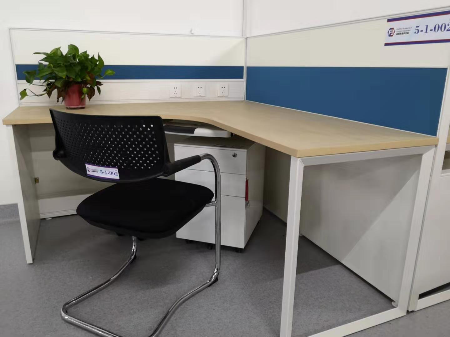 8、屏风钢架为暖白色,布料选用与现有工位一致的蓝色布料包裹,结构与款式相同。
