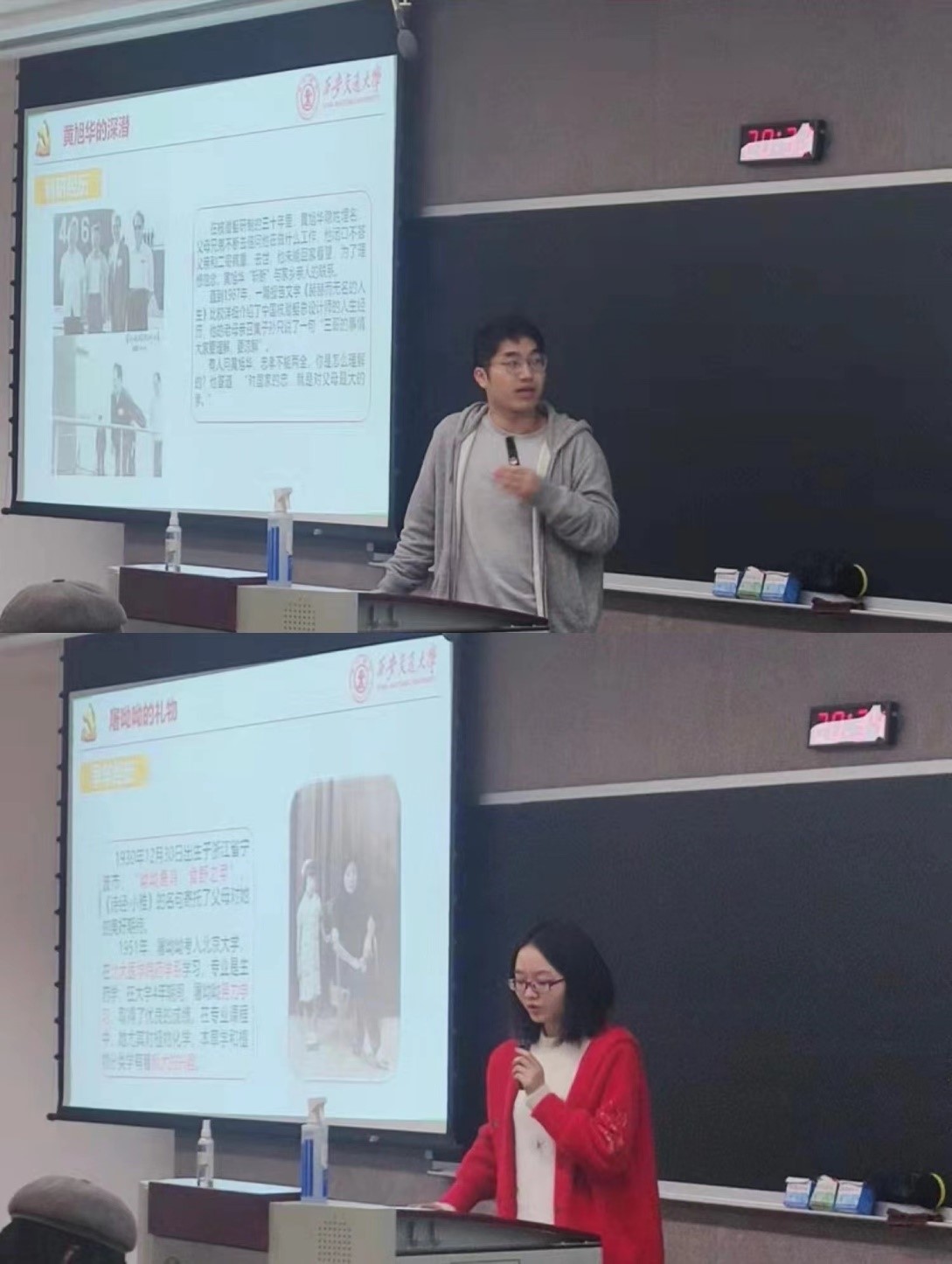 李传祥同学全面介绍了老英雄张富清的一生,从五个方面评价了这位老英雄:当兵的神话、深藏功与名、权力不及亲、永远在路上、心中无小我,最后用一句话概括就是:“73年党龄,60多年深藏功名,他用自己的朴实纯粹、淡泊名利,书写了自己精彩的人生。”连旭升同学从袁隆平院士的早年经历、科研之路、东方魔稻和元勋美梦四个方面,为我们展示了一位稻田的守望者,同时做着“禾下乘凉梦”与“杂交水稻覆盖全球梦”的令世人敬佩的伟人。