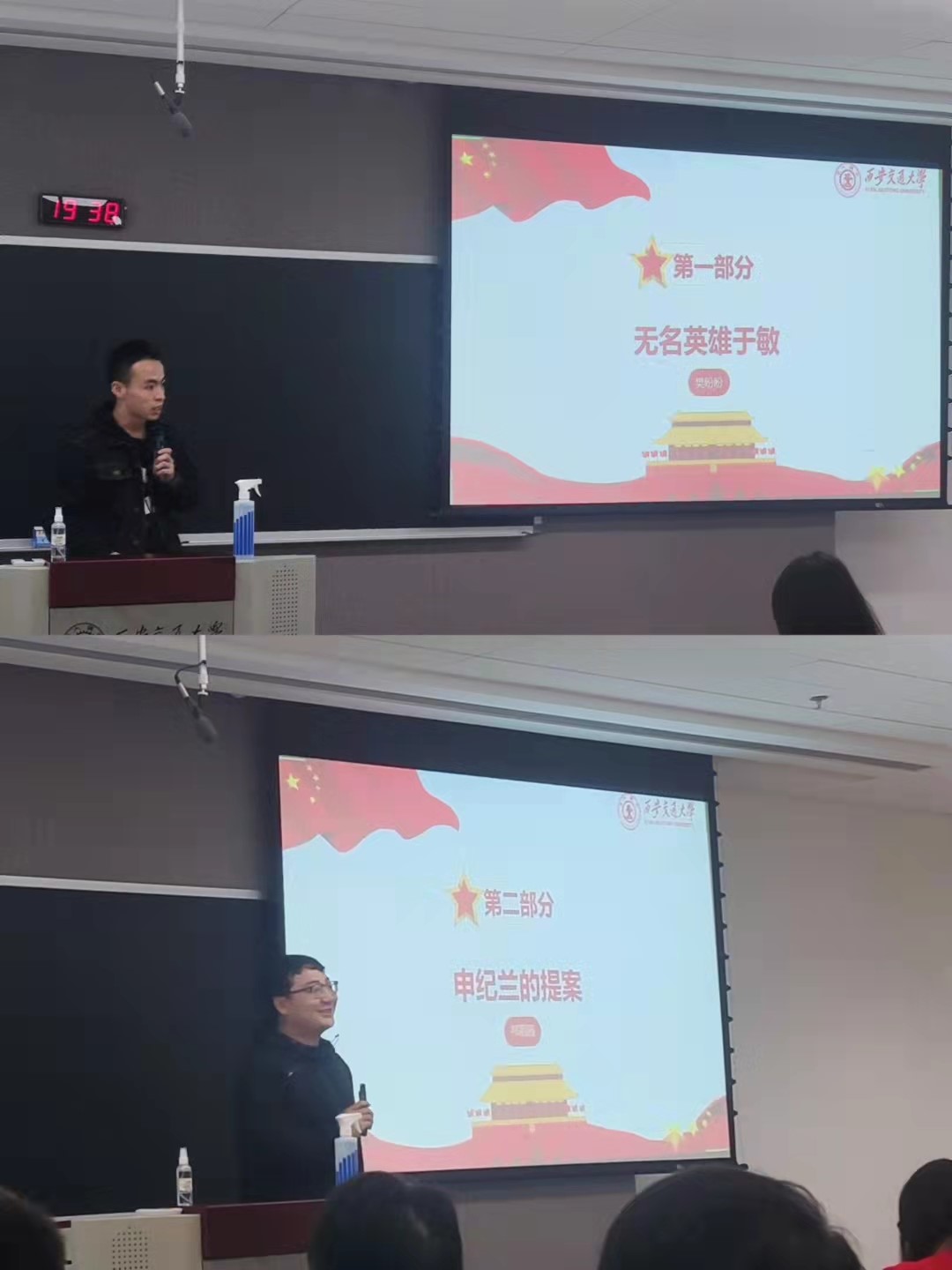 樊盼盼同学依据《功勋》和一些新闻资料,为大家介绍无名英雄于敏的功勋事迹,从人物简介、生活经历和科研经历三个方面出发全面讲述了于敏一生惊天的事业和沉默的人生。祁朋园同学截取了共和国勋章颁布时对申纪兰同志的介绍视频,讲述了申纪兰同志在男女同工同酬方面做出的巨大贡献,阐述了自己对“一个党员就是一面旗帜”的看法,引发了大家的思考和感悟。