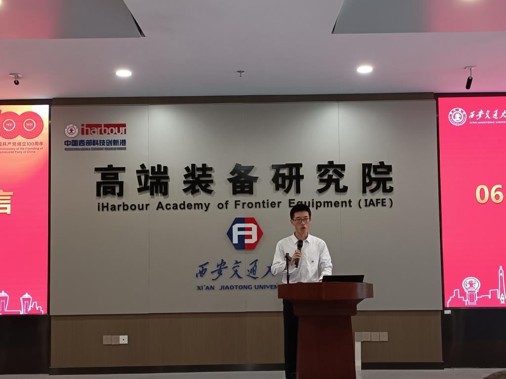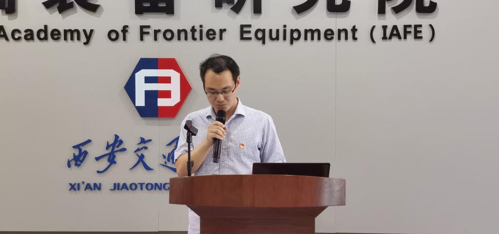 教职工优秀党员、创新港青年先锋代表黄军辉老师进行了发言。他汇报了新能源装备与质量工程研究所的前期建设,同时积极响应学校学院号召和学科发展脚步,推动研究成果转化,在提升团队建设的同时,也加强了与外单位的合作交流。他表示只要不舍昼夜,奋勇拼搏,不计较个人得失,一切以集体利益为重,任何困难都可以克服,一切不可能都可以变成可能,并且他将会继续发扬西迁精神,为交大的双一流建设以及机械学科的发展贡献力量。