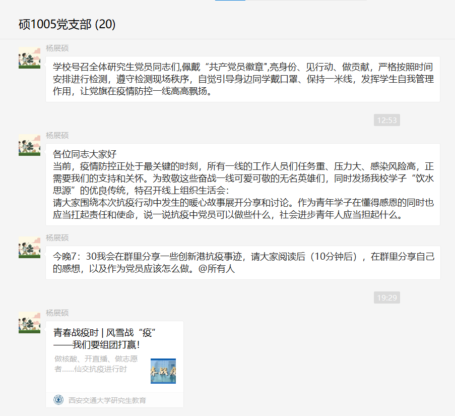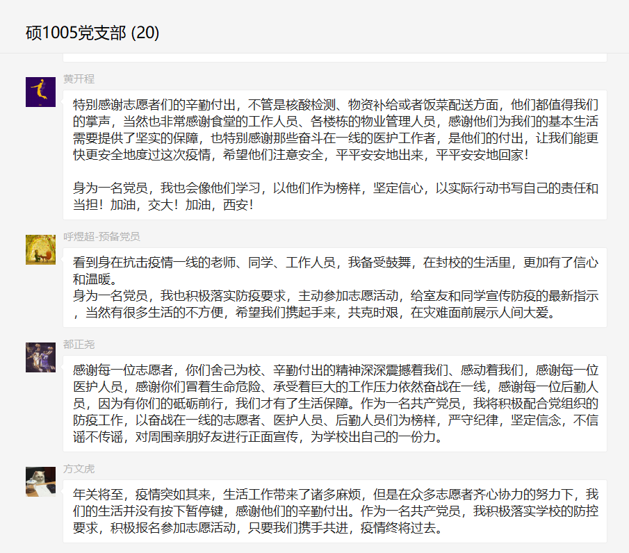 朱天伦同志分享道:“21年末,病毒袭击西安,古城紧闭、三秦不安,广大医护人员等战斗在抗疫一线的英雄们为一千三百万西安市民筑成了一道钢铁长城,保护着广大人民群众的健康。在创新港,也有一批医护人员、物业人员、后勤人员和志愿者不辞辛苦、不惧危险地为交大师生服务,将病毒挡在墙外,守护着一方土地。我作为研究生党员,为了发扬带头作用,贯彻为学生服务的宗旨,在隔离期间主要负责了36365线路检测中心no1必需生活物资的需求收集、集中采购与分发工作,还参与了一些其他志愿活动,尽我所能地在特殊时期履行好党员职责,服务好我院学生。我认为,每个党员都是一面旗帜,越是特殊时期越是发挥我们的作用的时候,关键时刻挺身而出才是党员本色。”