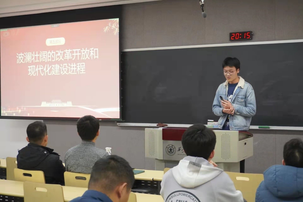 仇云硕同学首先介绍了《决议》对社会主义建设时期的总结,并结合我国建国以来的重大基础设施和国防科技建设成果,展现了社会主义建设时期的重大成就,重点讲解了两弹一星精神,并为大家朗诵了《七律·两弹一星》。