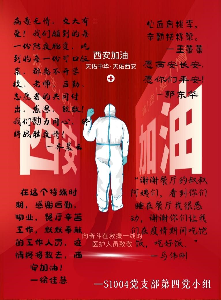 没有一个冬天不会过去,没有一个春天不会到来。我们戮力同心,终将战胜疫情。硕1004党支部向所有奋战在一线的抗疫工作人员致敬,西安加油!战“疫”必胜!